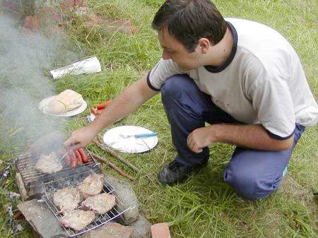 U stvari ja sam se dao na posao. Ispostavilo se da su svi već bili prilično gladni jer su svi (uključujući i mene) iskusno preskočili doručak. Tako sam ja morao da se žrtvujem i pečem meso i gledam meso kako se peče i mirišem meso koje se peče a onda okrećem meso na vatri pri tom naravno opet da ga gledam i mirišem i sve što ide uz to. Bilo je u početku prilično teško (i neprijatno za gladan želudac) a onda je naglo postalo lakše. Valjda je i želudac uvideo da mu od zavijanja nema ništa i da mora da se strpi. |