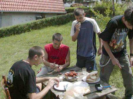 Najzad, i roštilj je bio gotov. Meso i kobasice ispečeni i postavljeni, vatra ugašena te se moglo pristupiti izjedanju. Moglo se primetiti da kod članova trupe ima raznih stilova jedenja. Sami procenite... |